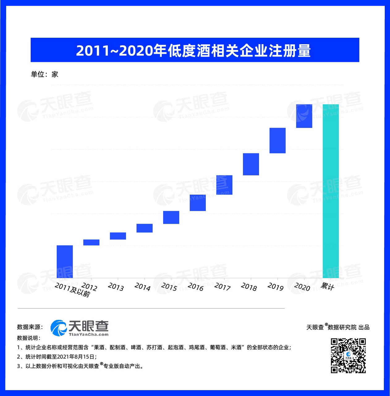 从注册时间上看,天眼查数据显示,近4成低度酒相关企业成立于5年内(全部企业状态)。其中,2016年和2017年是相关企业成立的高峰期,均新增注册超1,500家相关企业。