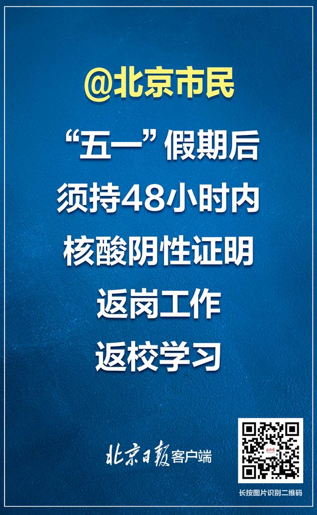 4月29日,在北京市新型冠状病毒肺炎疫情防控工作第319场新闻发布会上,市委宣传部副部长、市政府新闻办主任、市政府新闻发言人徐和建介绍,“五一”假期后,全市上班上学人员须持48小时内核酸检测阴性证明,方可返岗工作、返校学习。请广大市民朋友按要求进行核酸检测,社会各单位、学校也要落实防疫主体责任,严格查验核酸阴性证明,最大限度防范疫情风险,确保正常工作学习秩序。(来源:北京日报客户端)