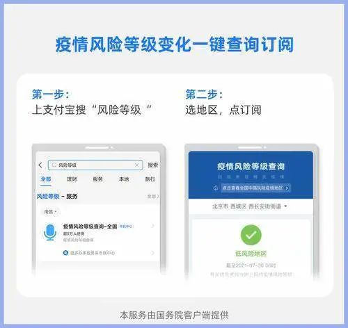 此外,如果你想知道自己所在地区或者出行目的地地区的疫情风险等级,国务院客户端已在支付宝上线了查询服务,您可搜“疫情等级”查看;此外,如有意愿需接种新冠疫苗,可上支付宝搜“新冠疫苗”进行预约接种,浙江、四川等地区还支持帮家人预约。