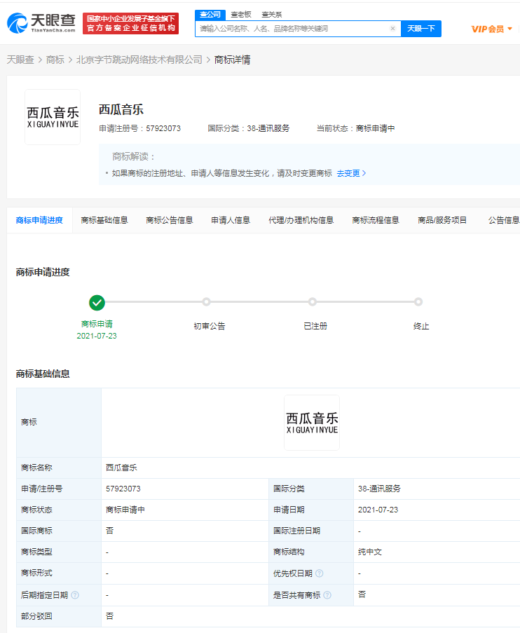 天眼查App显示,近日,北京字节跳动网络技术有限公司申请注册“西瓜音乐”“西瓜视讯”等商标,国际分类为通讯服务,目前商标状态为“商标申请中”。
