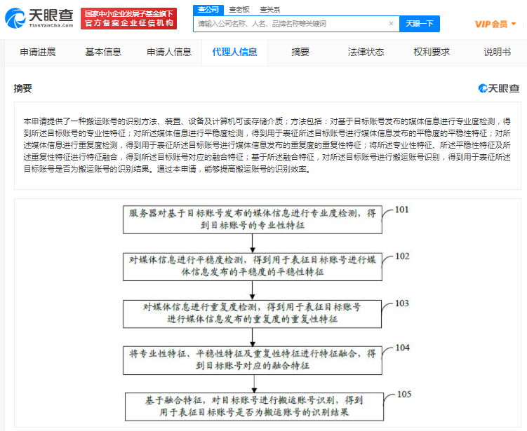 该专利摘要显示,本申请方法包括:对基于目标账号发布的媒体信息进行检测,得到所述目标账号的专业性、平稳性、重复性特征;将特征进行融合,得到所述目标账号对应的融合特征;基于所述融合特征,对所述目标账号进行搬运账号识别,得到用于表征所述目标账号是否为搬运账号的识别结果。
