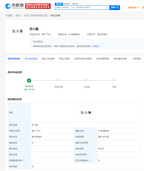 天眼查App显示,美团关联公司北京三快科技有限公司于7月30日申请注册“饭小圈”商标,现国际分类为教育娱乐,商标状态为申请中。