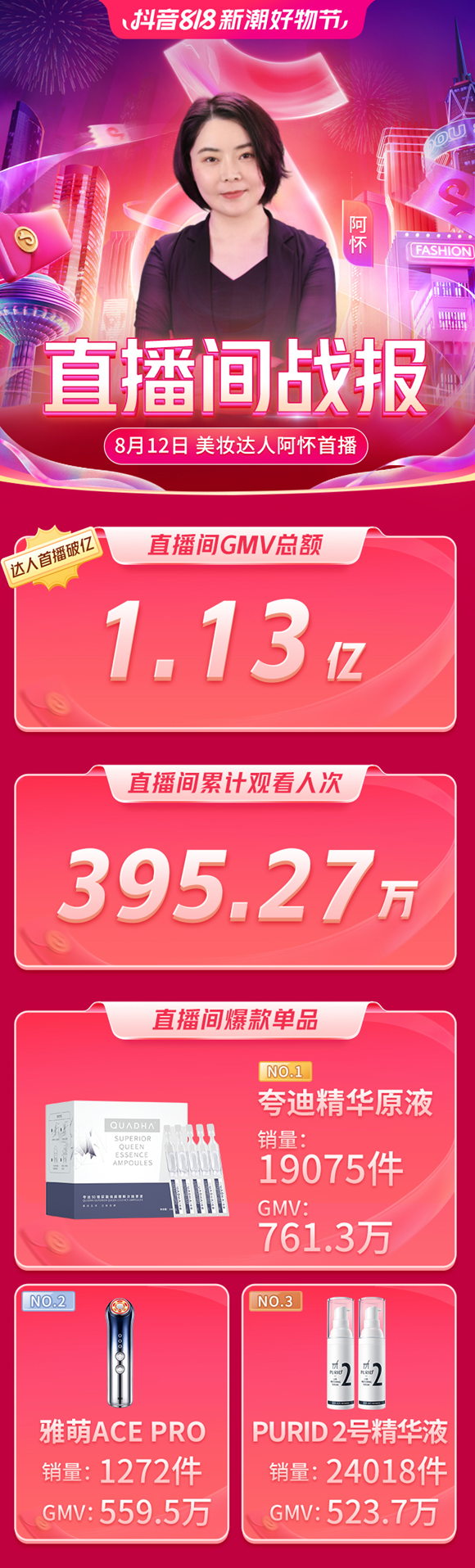 8月12日,“抖音818新潮好物节”美妆达人阿怀首播达成GMV1.13亿,直播间累计观看人次395.27万。直播间爆款单品夸迪精华原液销量19075件,GMV达761.3万。