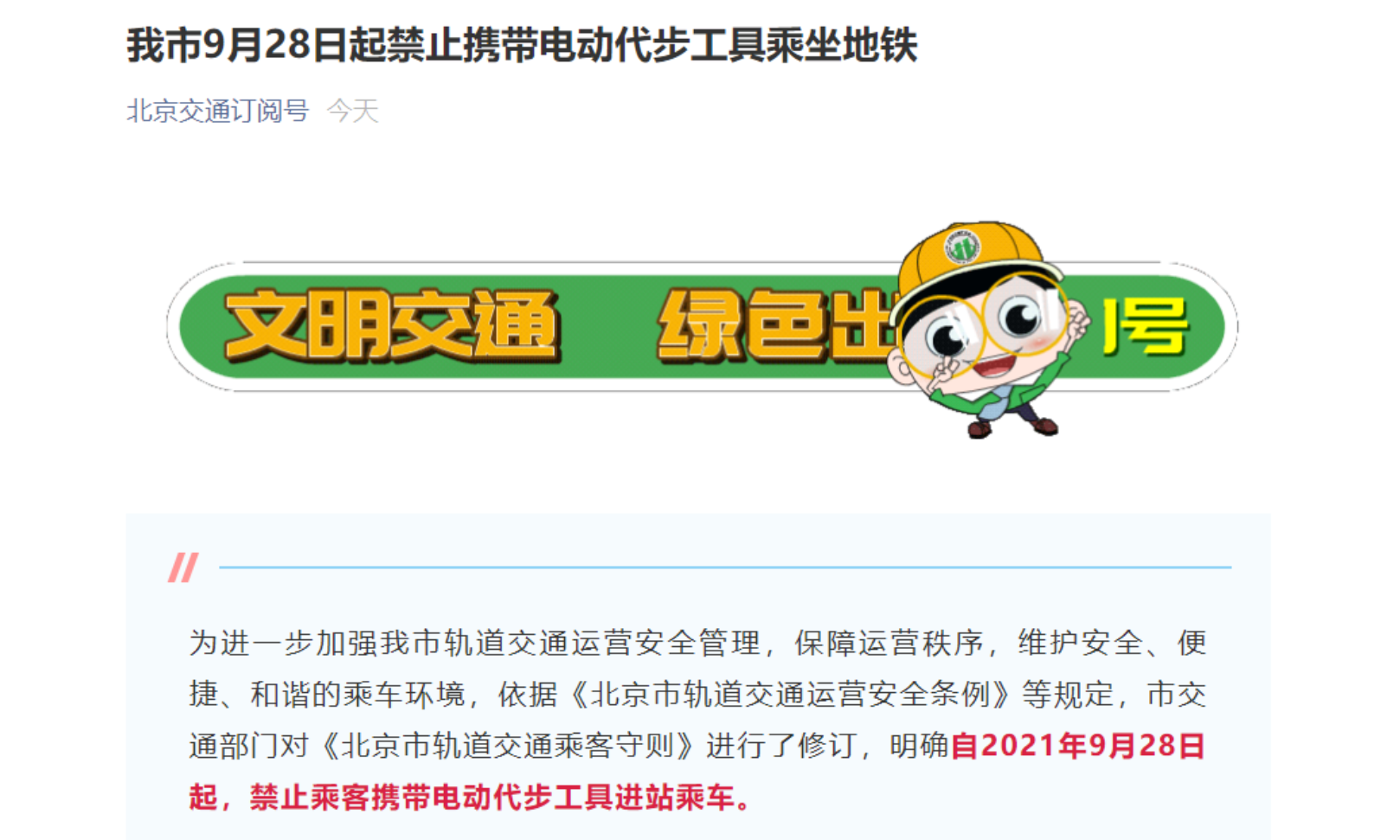根据微信公众号“北京交通订阅号”消息,为进一步加强北京市轨道交通运营安全管理,保障运营秩序,维护安全、便捷、和谐的乘车环境,依据《北京市轨道交通运营安全条例》等规定,市交通部门对《北京市轨道交通乘客守则》进行了修订,明确自 2021 年 9 月 28 日起,禁止乘客携带电动代步工具进站乘车。