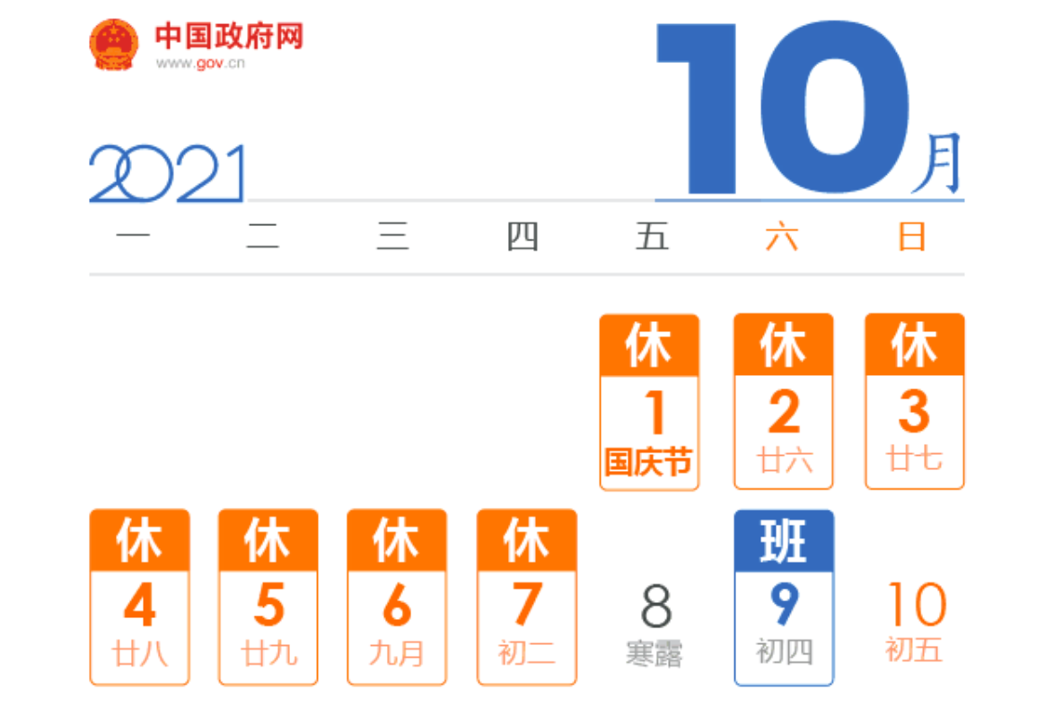 据中国政府网8月19日消息,2021年中秋、国庆假期放假安排已出炉!中秋节:9月19日至21日,放假调休共3天;国庆节:10月1日至7日,放假调休共7天