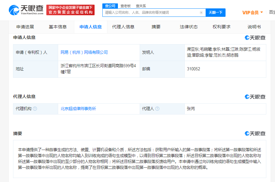 天眼查App显示,8月10日,网易(杭州)网络有限公司获得“一种故事生成的方法、装置、计算机设备和介质”专利授权,公告号CN111737961B,申请日期为2020年6月。