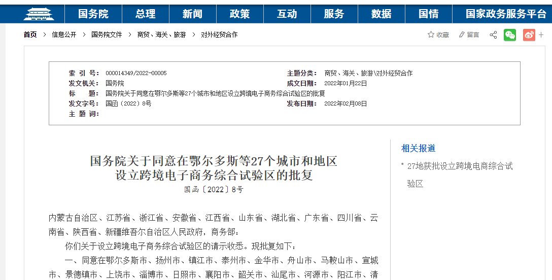 国务院关于批复鄂尔多斯等27个城市和地区设立跨境电子商务综合试验区